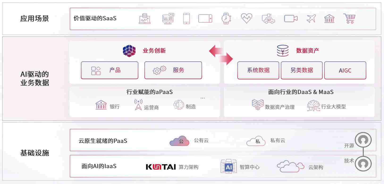 数字时代,,,,围绕企业数字化转型的关键要素,,,,www.kaiyun.com数码开创性的提出数云融合战略和技术体系框架,,,,着力在云原生、、、、数字原生、、、AI原生和信创产业上架构产品和服务能力,,,,为处在不同数字化转型阶段的快消零售、、、、汽车、、、、金融、、、、医疗、、、政企、、教育、、运营商等行业客户提供泛在的敏捷IT能力和融合的数据驱动能力,,构建跨界融合创新的数字业务场景和新业务模式,,,,助力企业级客户建立面向未来的核心能力和竞争优势,,,全面推动社会的数字化、、、、智能化转型升级。。。