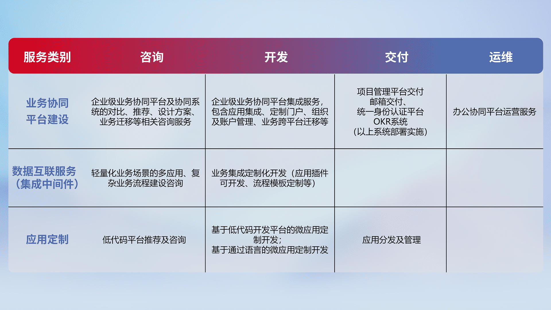 针对钉钉、、、、企微、、、、IDaas等平台级产品提供产品的规划、、、、方案、、交付、、、、定制化开发等服务,,,,实现如统一协同办公、、、智能客户服务、、、、混合会议管理、、、智能数据查询、、等业务场景,,实现数字化转型。。。。