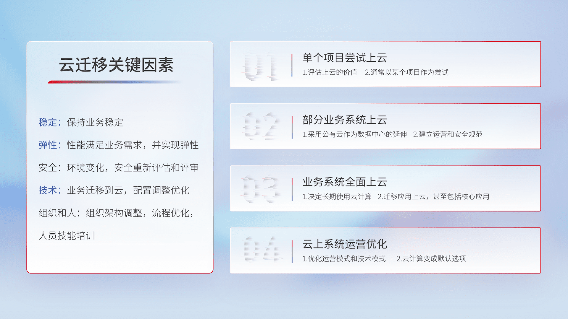 结合实际业务,,从规划设计、、、、云平台选型、、、云原生改造、、、数据迁移、、、集成交付,,迁移全过程为客户识别最佳上云路径,,,做好风险识别管理,,设计网络架构、、身份权限、、、安全审计合规、、、、操作审计、、、日志审计、、、、监控告警策略、、、多站点容灾设计等,,对云上基础设施进行整体规划,,提升IT治理水平,,,以满足弹性、、、、高可用、、高性能的需求。。