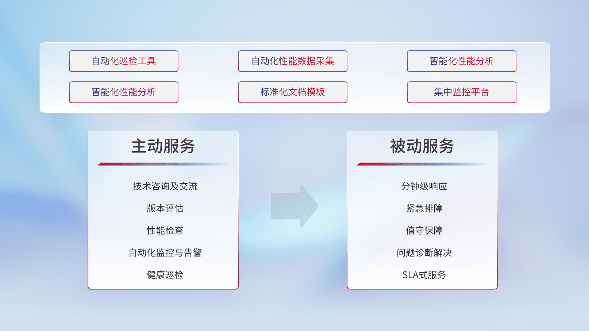智能化工具和标准化文档,,保障服务质量,,,,提供主动服务(包含技术咨询、、、版本评估、、性能检查、、、、自动化监控与告警、、、、健康巡检)和被动服务包含(分钟级响应、、、紧急排障、、、、值守保障、、问题诊断解决、、、SLA服务)。。。。